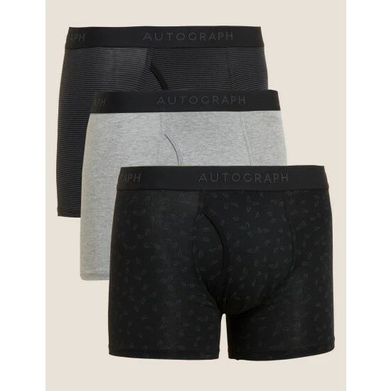 Crafted from premium cotton, these Autograph trunks will add a luxurious feel to your everyday essentials. The classic design features a neat fly front fastening and added stretch for comfort. This three-pack includes one plain pair, one striped design and one with a distinctive leaf print. Autograph: premium investment pieces featuring contemporary cuts and refined finishing touches.