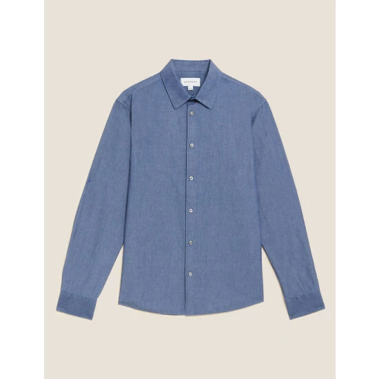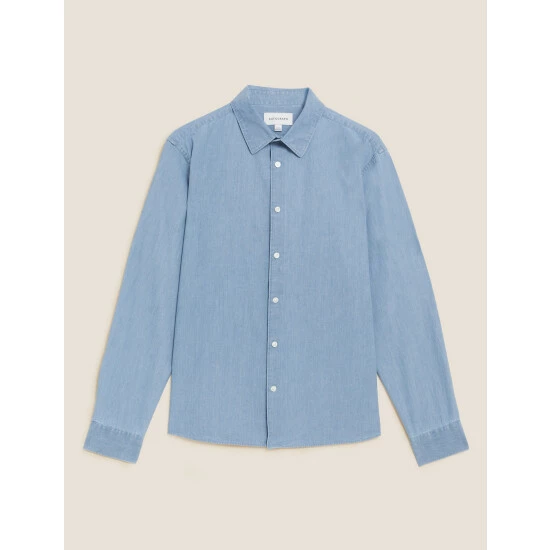 This Autograph denim shirt puts a smarter spin on the classic casual style. The easy regular fit design has a collared neckline and long sleeves. Plus, our easy-to-iron finish means it only needs a quick press. All M&S denim is made with responsibly sourced cotton and less water. Autograph: premium investment pieces featuring contemporary cuts and refined finishing touches.