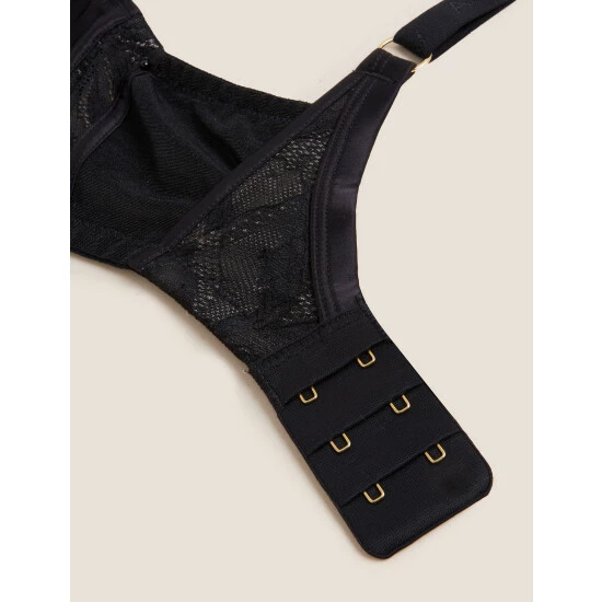 This minimiser bra from our Autograph range exudes femininity whilst offering total comfort throughout the day. It’s designed with underwiring to fully support the bust. The non-padded cups enhance your natural shape and feature delicate lace and mesh panels. Exclusive gold Autograph branded hardware adds a signature finishing touch. Made with recycled nylon. Autograph: refined fabrics and modern silhouettes for an effortless, understated style.